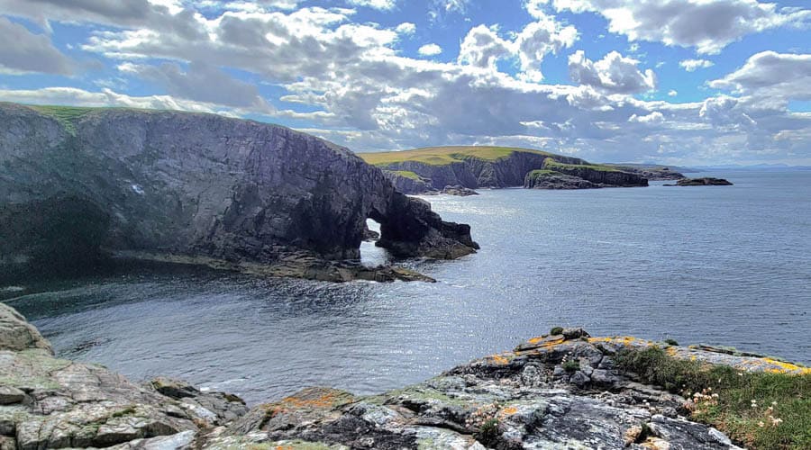 Doch noch ist der Tag nicht auf seinem Höhepunkt. Nach dem Kyle of Tongue queren wir eine bergige Landzunge. Auf der Höhe ein See mit malerischen kleinen Inselchen. Felsen schauen weiß aus dem grünen Gras und hinter dem Hügel sieht man bereits wieder das tiefblaue Meer und die Klippen. Sonnenflecken zaubern intensiv leuchtende Tupfen in dieses zauberhafte Panorama.