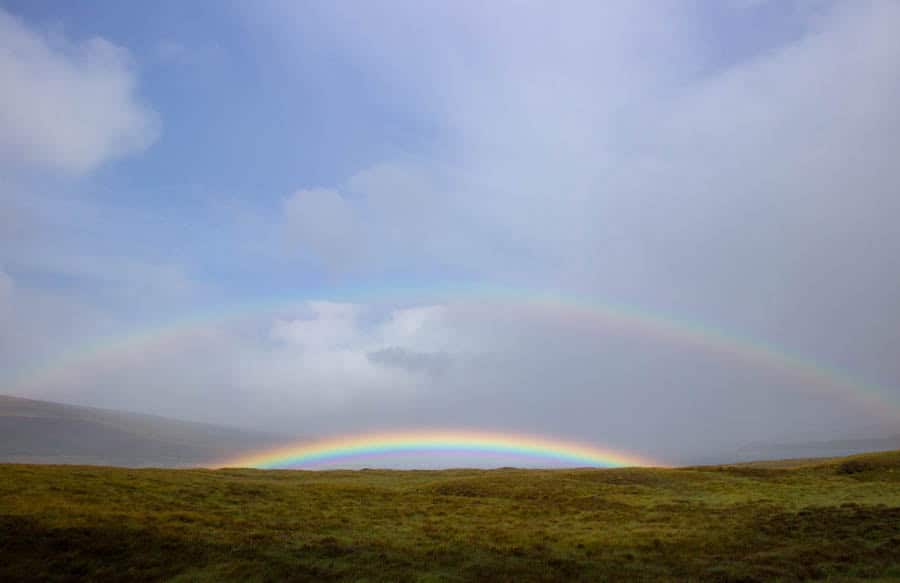 Die Straße umrundet den Loch Eribol komplett und das Wetter spielt wieder einmal die Hauptrolle bei einer dramatischen Inszenierung. Wir erleben in einer halben Stunde alles, von blauem Himmel mit weißen Wolken und dem Licht das auf den Hügeln spielt, über bleigrauen Himmel, Regen und dichten Nebel. Am Ende des Lochs erwartet uns dann noch ein doppelter Regenbogen, bevor wir ans andere Ufer wechseln.