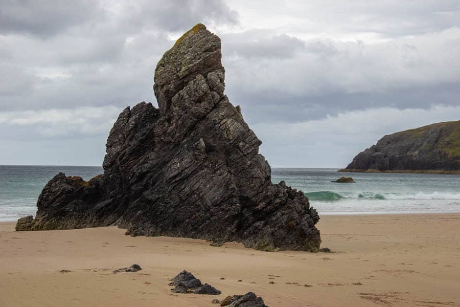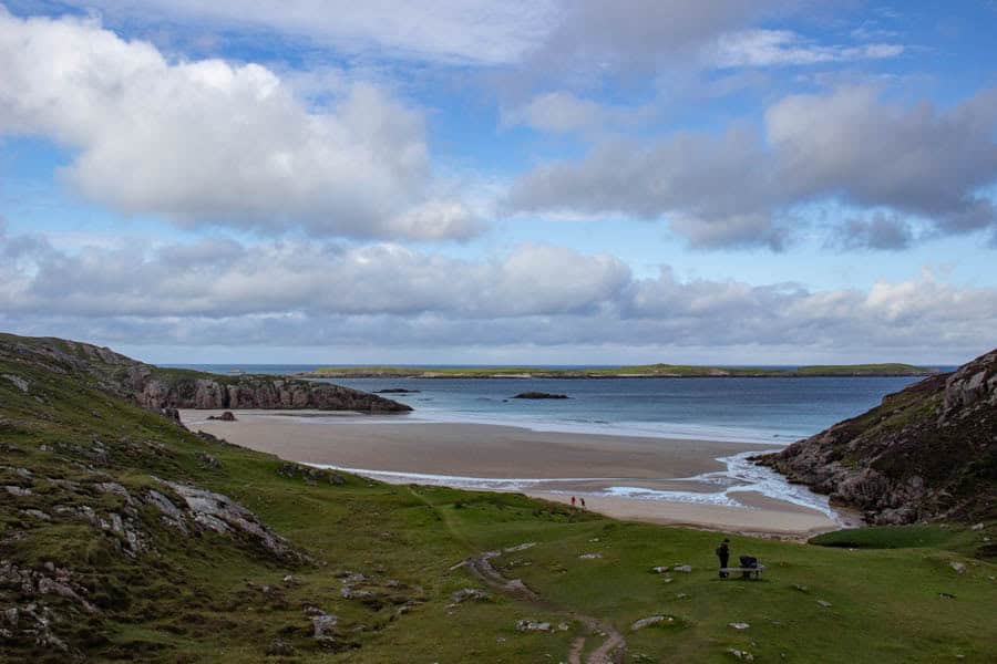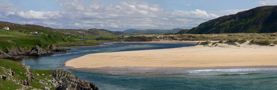 Nach Loch Eribol beginnt bis einige Kilometer bis Durness ein wirklich zauberhafter Küstenabschnitt mit kleinen Buchten, weißen Sandstränden, türkisblauem Wasser und orange- bis dunkelroten Felsen. Man erwartet es nicht hier im hohen Norden, aber Schottland hat gerade hier und auf den Inseln kilometerweise unglaublich schöne Strände.