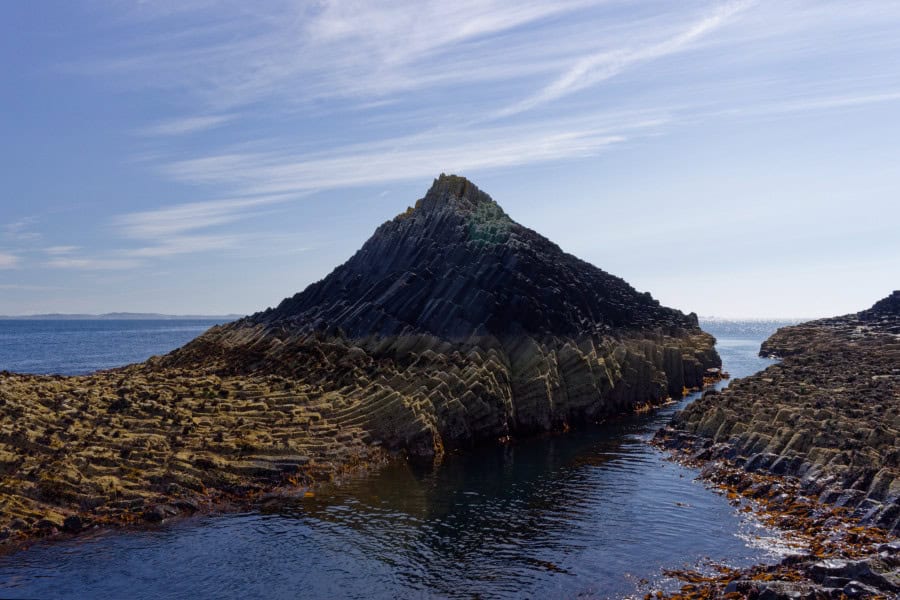 Ähnlich wie die berühmten Gesteinsformationen auf der Isle of Skye, entstanden die Landschaftsformen der Isle of Mull als Folge von Vulkanausbrüchen vor etwa 60 Millionen Jahren als sich während des Auseinanderdriftens der Kontinente der Atlantik bildete und die Erdkruste riss. Das schwarze Basaltgestein wird vor allem an den eindrucksvollen Klippen der Westküste sichtbar. Auch die höchst Erhebung der Insel, der Ben More mit fast 1000 Metern ist der Überrest eines alten Vulkankraters. An vielen Stellen sind auch die markanten 6-eckigen Säulen aus Basalt sichtbar.