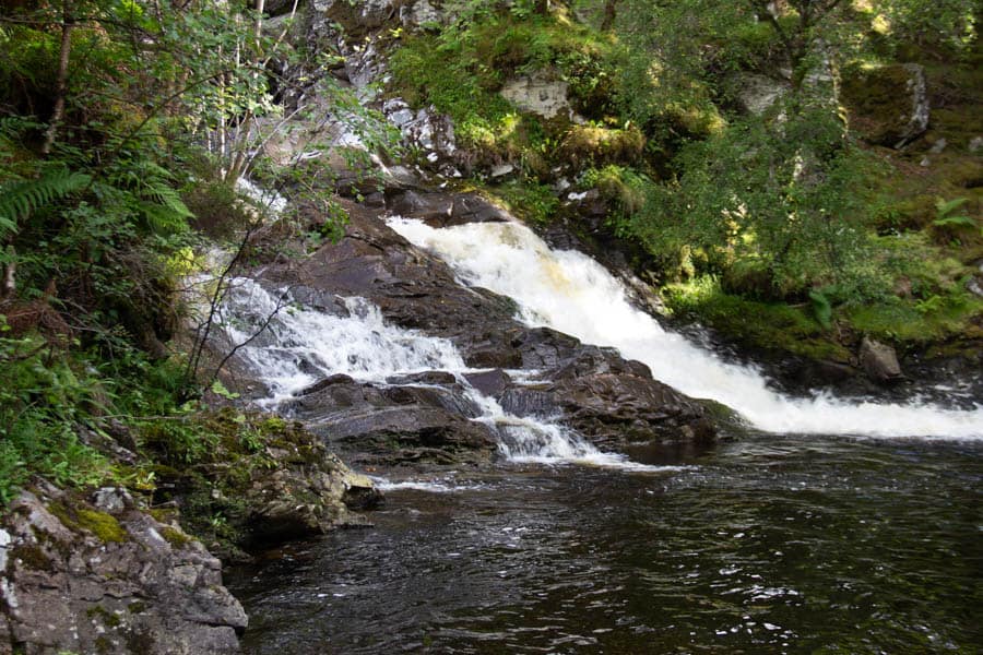 Kurz nach Bridge of Balgie, noch auf dem Territorium das lokalen Meggernie Estate, finden wir dann zufällig noch zwei zauberhaften Wasserfälle. Inzwischen scheint sogar mal für einige Minuten die Sonne und es ist einfach nur schön. Wieder so ein typischer Highland Moment, der die Verbrechen der schottischen Art der Forstwirtschaft auf der gegenüberliegenden Straßenseite fast vergessen macht.