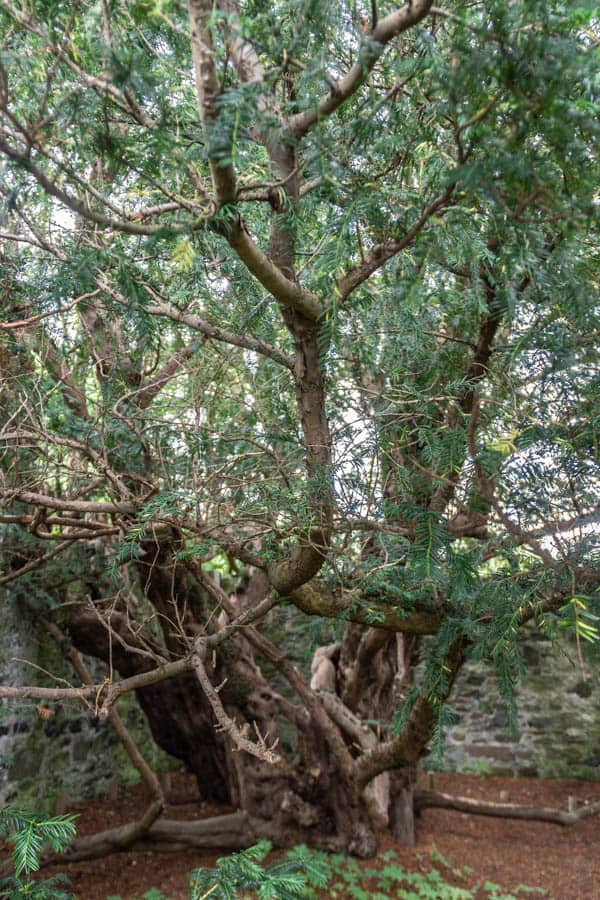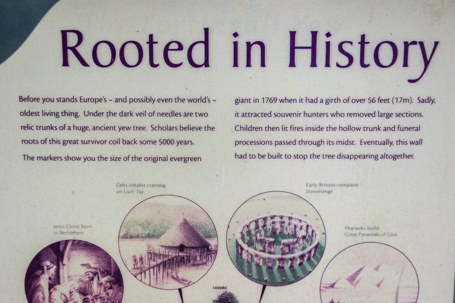 Unser erstes Ziel ist der womöglich älteste Baum Europas: Die Eibe von Fortingall. Sie soll 5000 Jahre alt sein und ihr Stammumfang maß einmal 17 Meter. Heute sind nur noch Fragmente davon übrig, da immer wieder Besucher Teile des Baumes als Souvenir mitgenommen haben. Aber der in mehrere Einzelteile zerfallene Stamm ist immer noch vital. Inzwischen wird der Baum von einer Mauer geschützt. Schade, dass solche Maßnahmen immer wieder nötig sind. Dass Menschen immer und überall solche Wunder rücksichtslos zerstören. Leider kann man dem Baum nun nicht mehr wirklich nahekommen, aber auch so spürt man seine besondere Ausstrahlung.