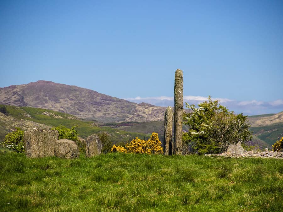Das Panorama bringt mich letztendlich auch dazu den Kompass hervorzuholen, denn es gibt einige markante Punkte am Horizont. Wenn man zwischen den beiden großen Steinen steht, schaut man direkt auf einen Hügel, der den Sonnenuntergang zur Sommersonnwende markiert und der singulär stehende Kegel des Douce Mountain befindet sich von der Mitte des Steinkreises aus gemessen in Richtung des Sonnenaufgangs zu Beltaine und Lughnasad.